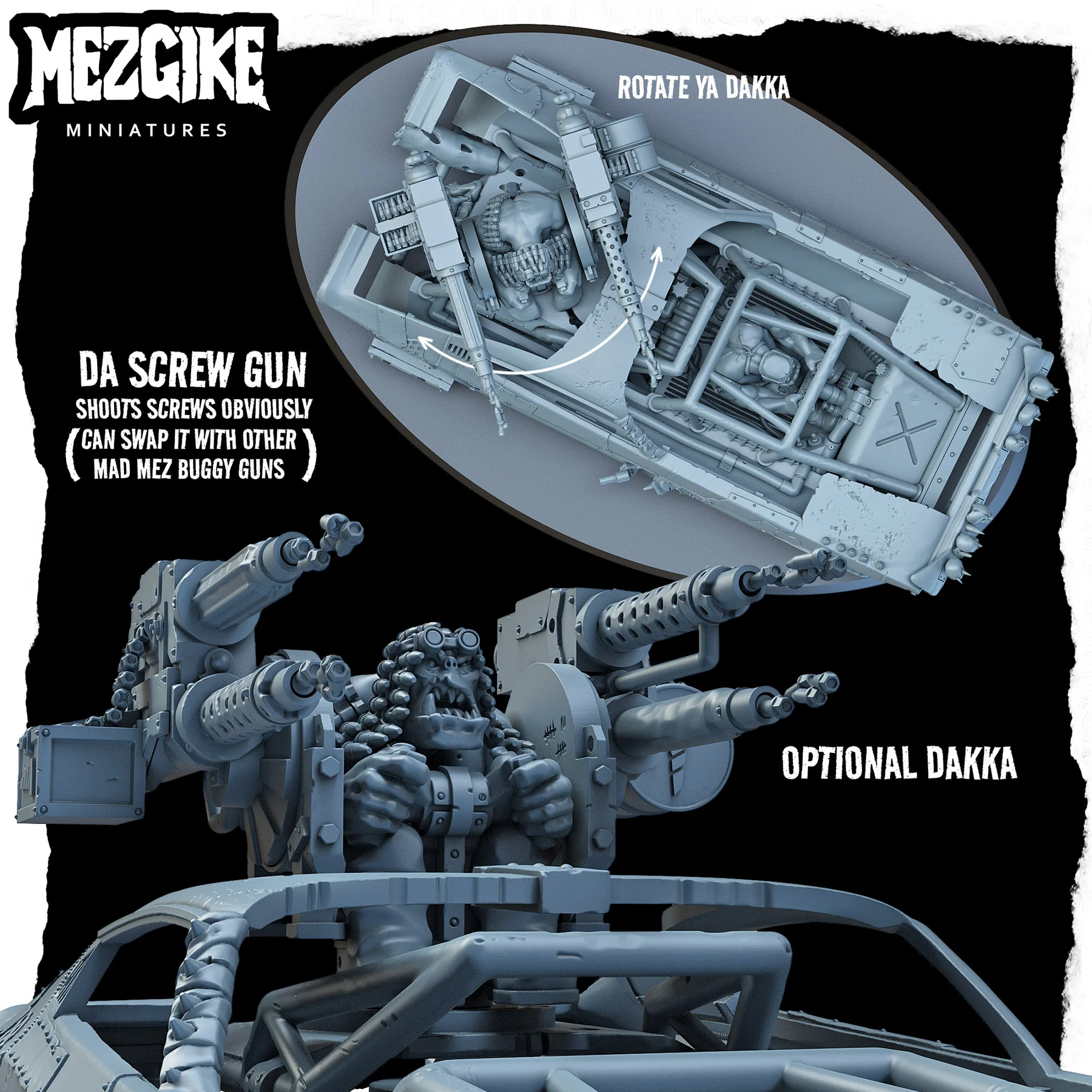 Mad Mez orc buggies fang it across the deserts of Urf, racing to claim every bit of land and loot for their octane-obsessed warlord, da Gigaboss. Da Screw Farmer is a particularly resourceful mek that owns loads of factories across the scrap lands. These factories make all the screws, rivets and bolts that are used to build orc tech and machinery. So of course, why shouldn’t they be used to make a big kannon that fires screw and rivets! Mounted to his rattly track wagon, Da Screw Farmer slides across the battlefield spray an endless storm of metal in all directions.