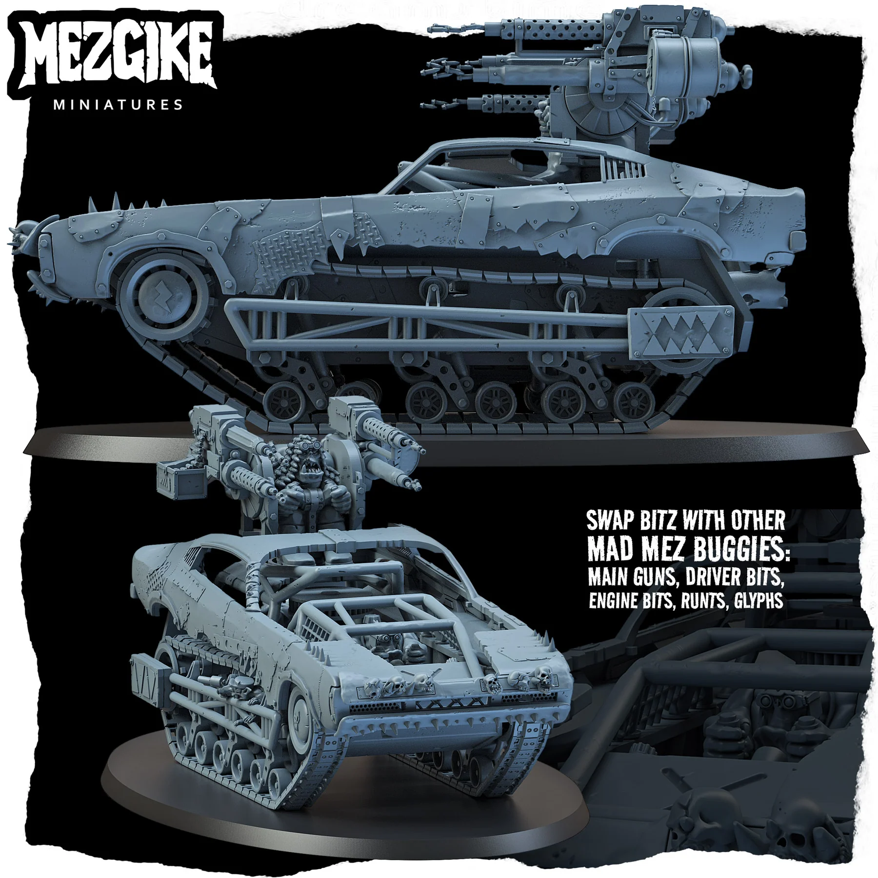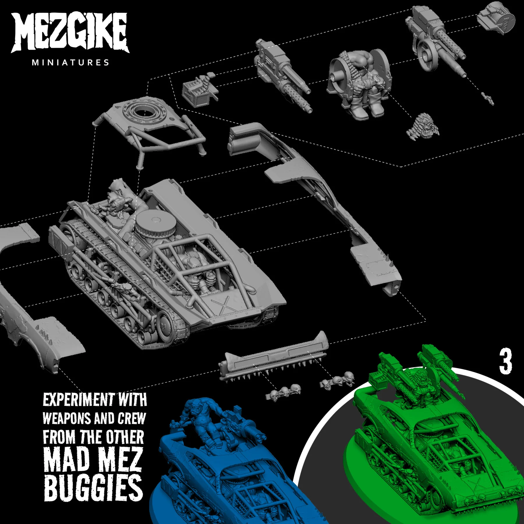 Da Screw Farmer is compatible with all other Mad Mez buggies. They are designed to allow you to swap any of the main guns, drivers and engine parts. This means that you could have very different looking buggies, each with the same main weapon, or all different weapons if you wish.