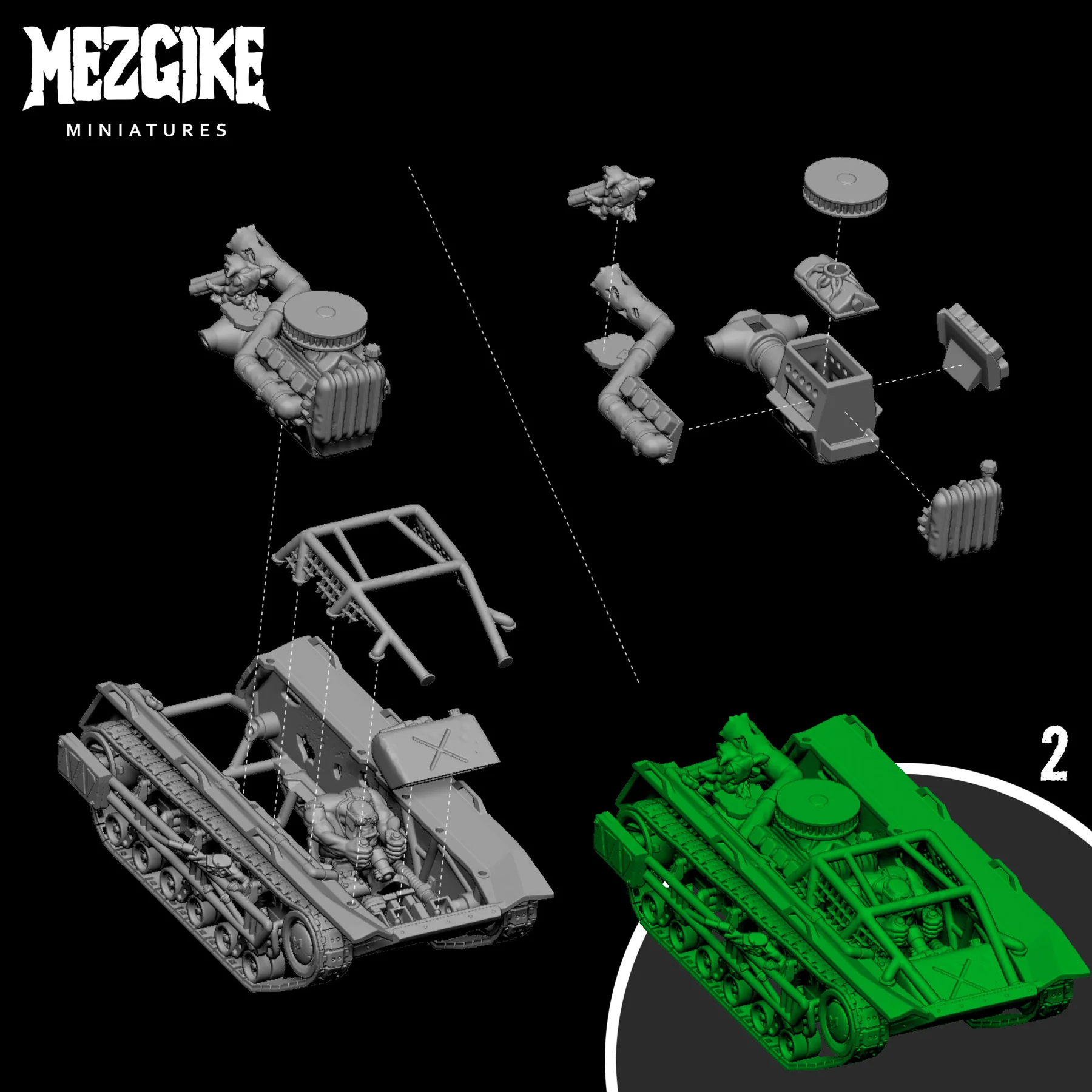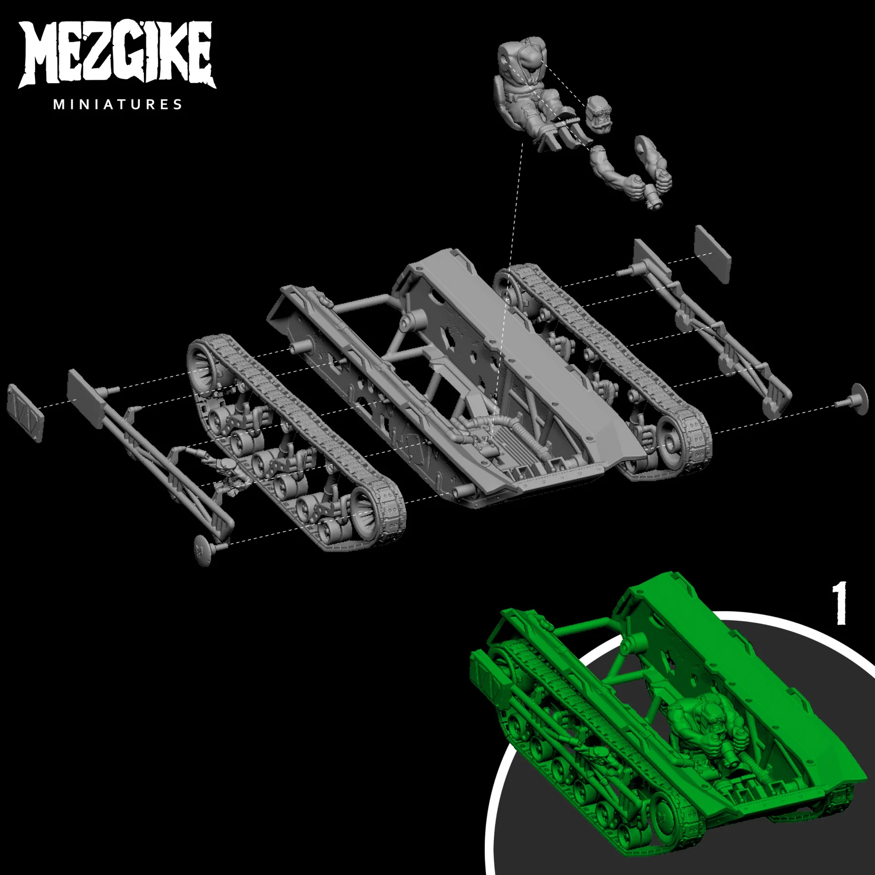 Assembly advice: make sure you dry fit the parts before gluing, to ensure your model fits nicely. The set comes with some accessories and options. The orc gunner is able to pivot, so you can get the pose as desired. The orc heads are also compatible with other Mezgike orc heads.
